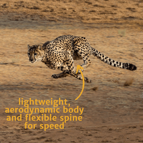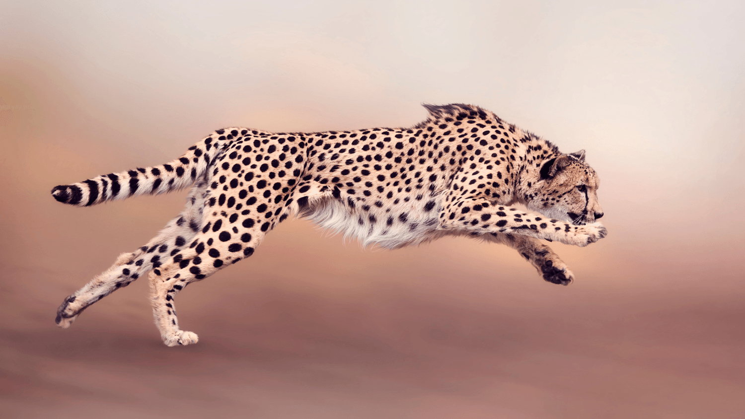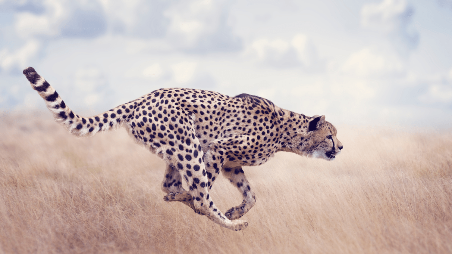 They can reach speeds up to 112 km/h (70 mph), but only for short bursts of about 20–30 seconds before overheating. Their stride can stretch 6-7 meters (about 20 feet) in a single leap, and they take nearly four steps per second when running at top speed. To support that sprint, their spine acts like a spring, stretching and contracting with each stride, their claws grip the ground like cleats, and their tail works like a rudder, helping them turn quickly while chasing.